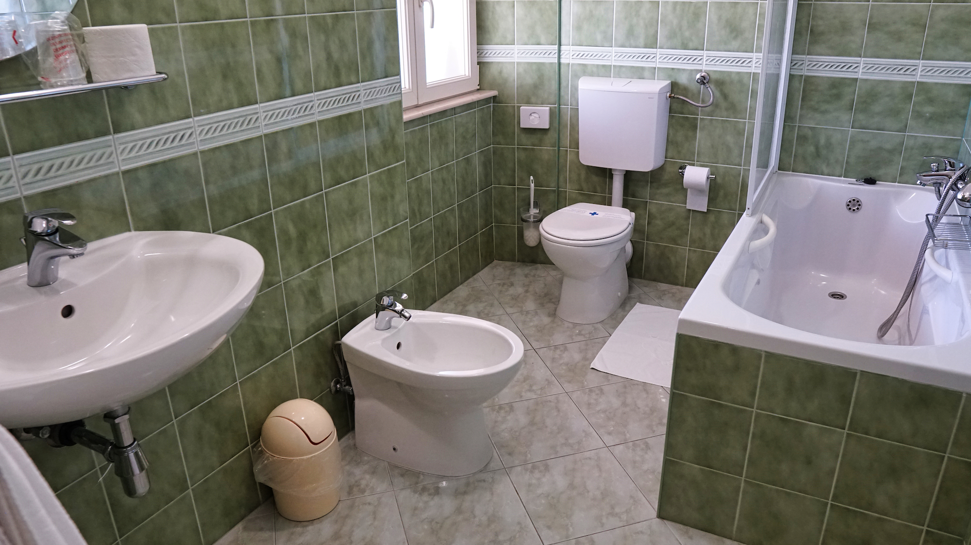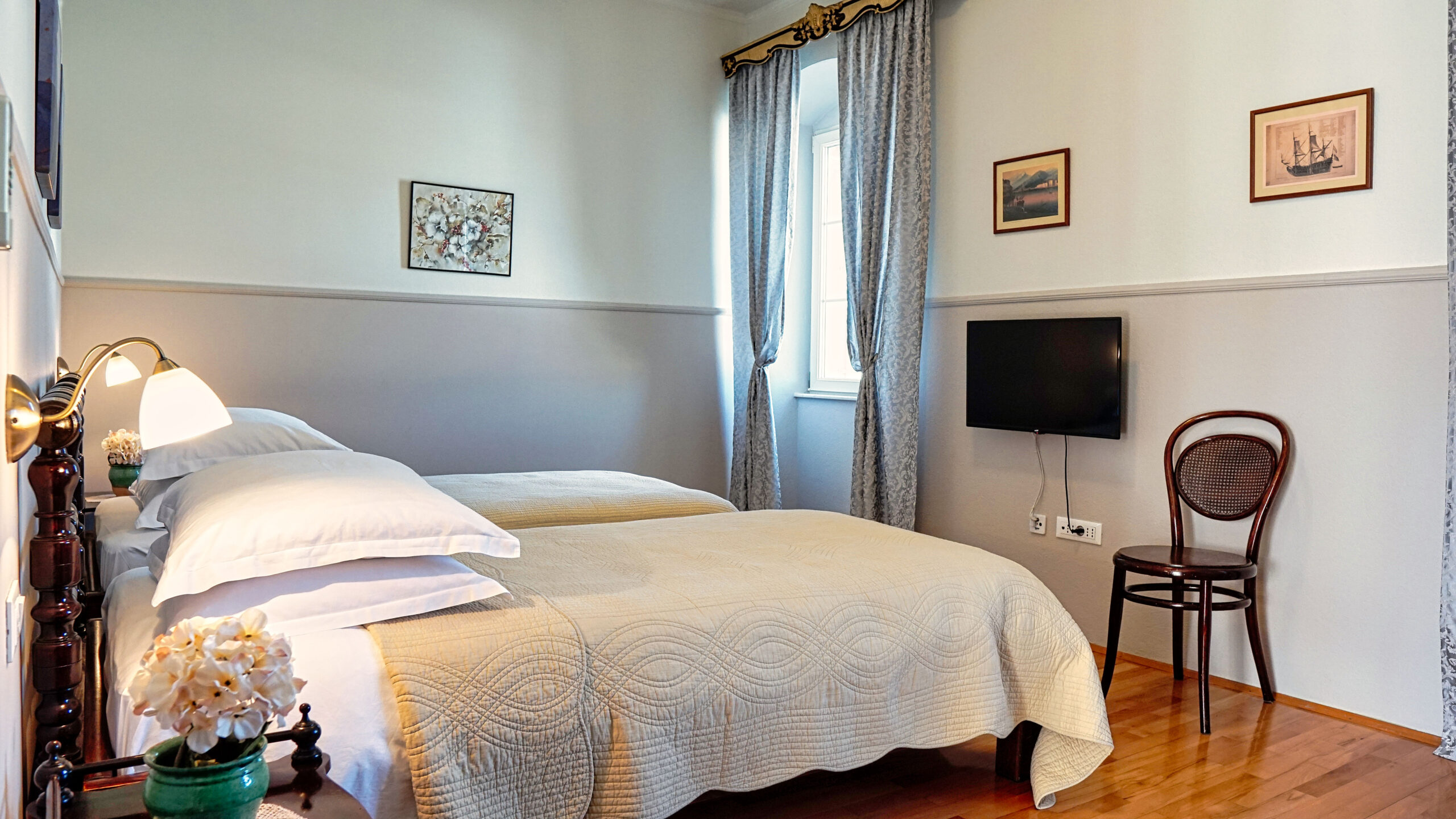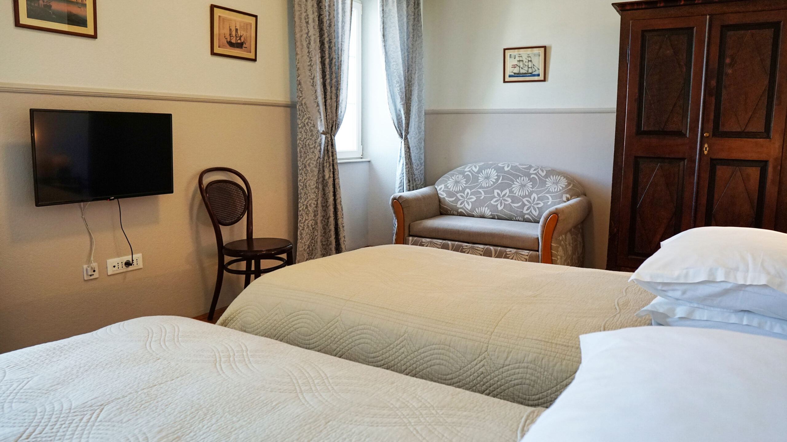 Room cca 25 m2, view of the town and sea, twin beds 100×200, air con, LCD TV, mini bar, hairdryer, free WI FI, safe box, soundproof windows, common terrace with sea view, continental breakfast included in the price, daily maid service.